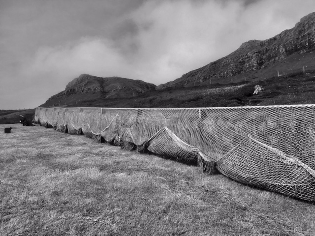 It is a dry summer’s day and we are busy raking the grass and placing it on long drying racks (turkilagar) that line the hilly pastures running from top to bottom. Flocks of starlings feast noisily on clews of worms that are revealed as the rake drags across the earth. Covered in nets, the grass is left to dry on these racks in the wind. It is imperative that the grass is dried as much as possible before the rain comes which can be taxing in the Faroes. More than the rain, the farmers fear fog and windless days. Providing there is wind, the grass normally dries even if there is the odd shower of rain. This summer has been rather dry and the farmers are hopeful that we will have a good harvest of hay to feed the sheep over the winter. Sunshine has been forecast for the whole week and all going well the grass should be sun-bleached in ten days or so. If the grass gets very wet, it turns into a soggy mush, a useless liability and a rotting curse. Nowadays, it is less important than it was before. Almost no farmers are dependent on just sheep anymore and some now have silos to make silage. Previously, a wet harvest could have had disastrous consequences. This is the last day of harvesting the grass to make silage. Everyone is helping out to make sure the job is done. Aside from the grass that is being dried the old-fashioned way, this grass will be stored in airtight silos and fermented using formic acid and water. Men tread the grass in silos as if it were grapes; they try to squeeze out as much of the air as possible. There is little baling here for the ground is so uneven and the slopes are so steep. That must in part explain why farming methods are barely unchanged.